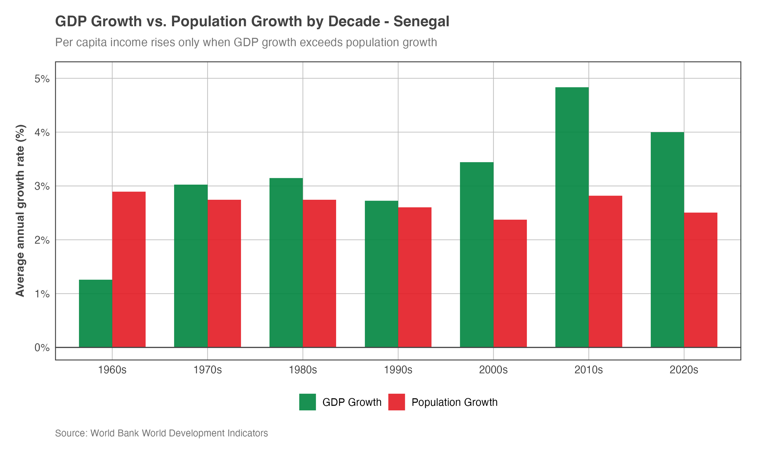 Examining growth dynamics by decade reveals when Senegal escaped the Malthusian trap. During the 1960s, population growth (2.9%) dramatically exceeded GDP growth (1.2%), driving per capita income downward. This pattern persisted through the 1970s-1990s, with GDP growth barely outpacing population expansion. Only in the 2010s did the gap widen significantly, with GDP growth reaching 4.8% while population growth moderated to 2.8%, finally generating substantial per capita gains. The 2020s maintained this positive differential (4.0% GDP growth versus 2.5% population growth), suggesting Senegal may have permanently escaped the trap that constrained development for so long.