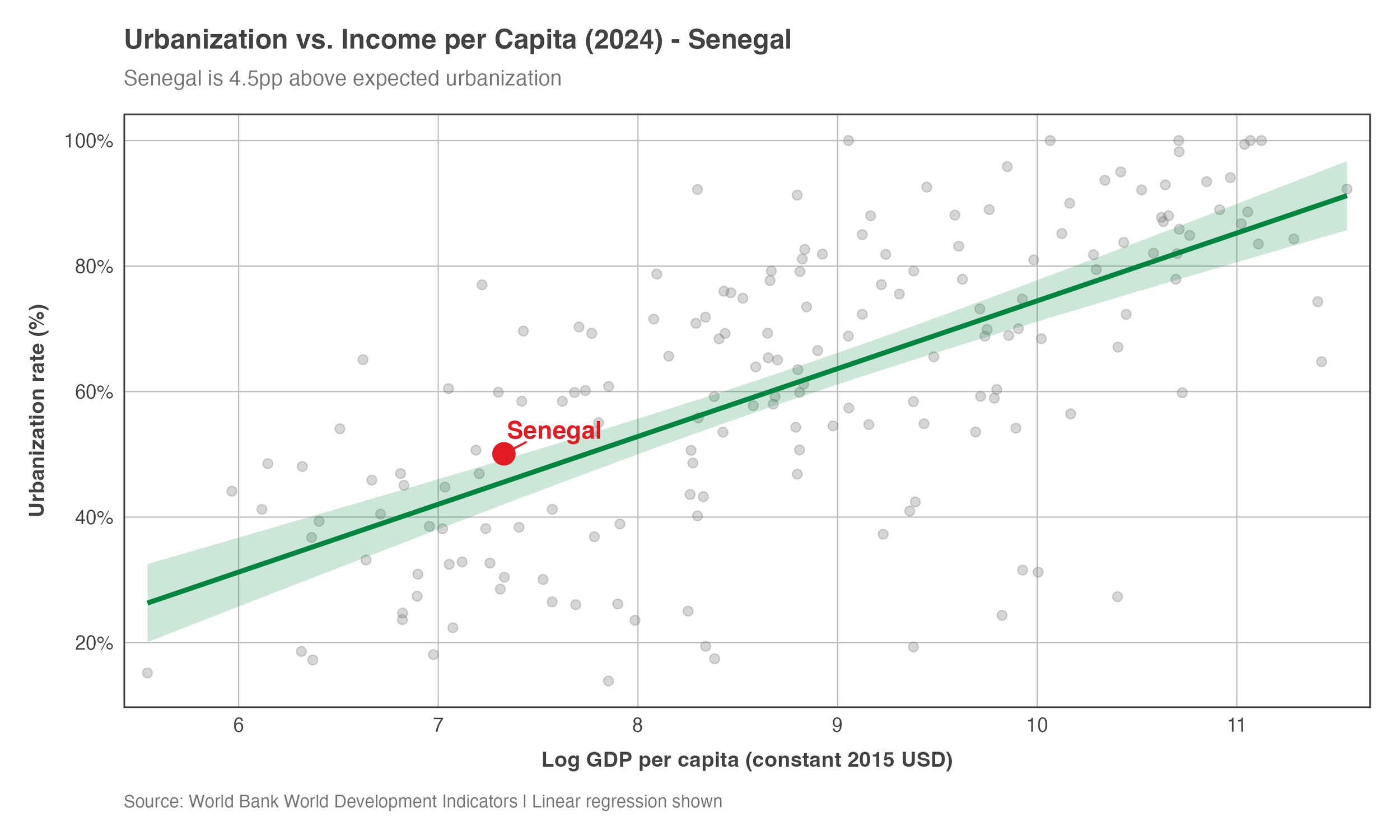 Cross-country comparison reveals Senegal is 4.5 percentage points above expected urbanization for its income level: at $1,500 GDP per capita, the model predicts 45%, yet Senegal achieved 50% (figure 13). Since 1985, Senegal’s urbanization has exceeded the global trend, indicating rapid urban concentration.