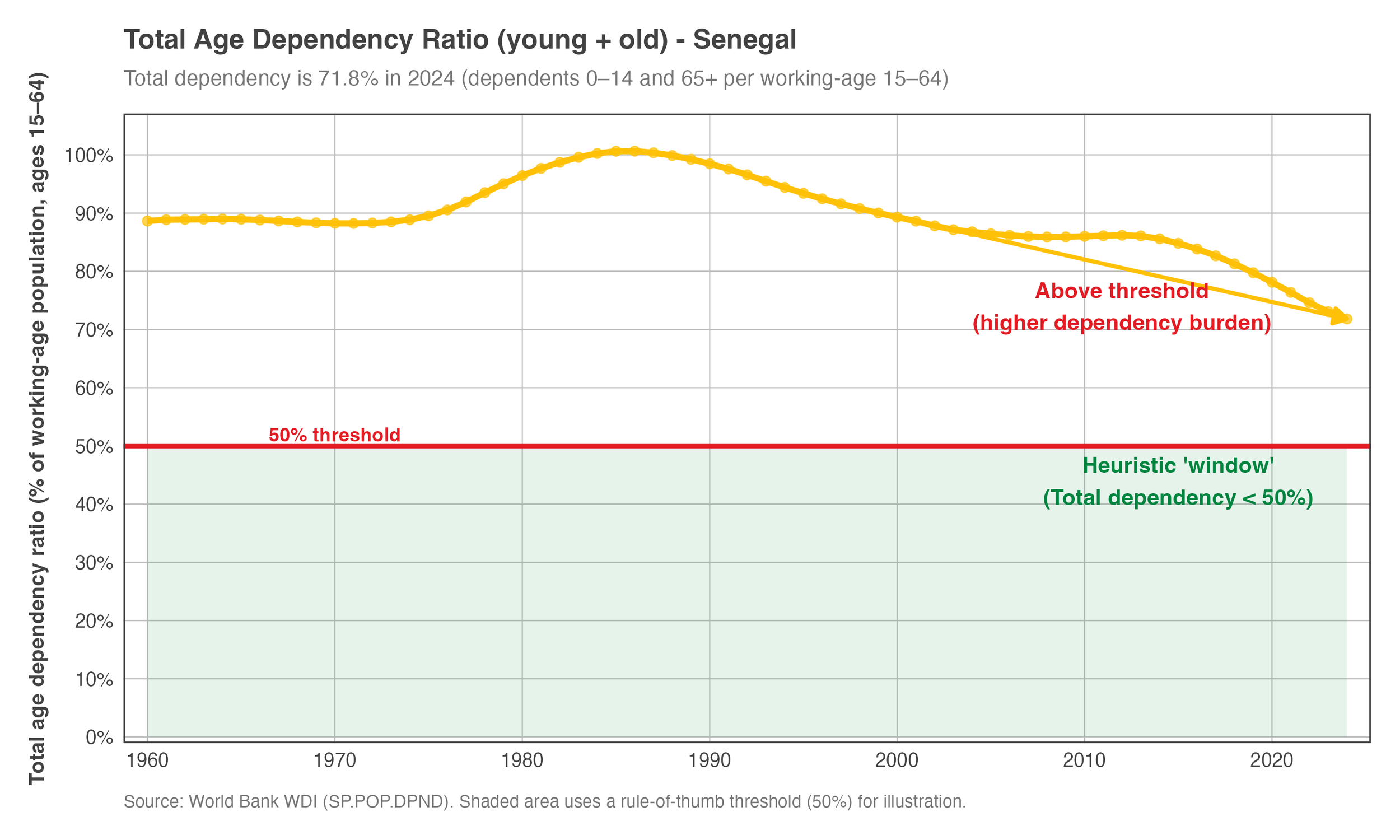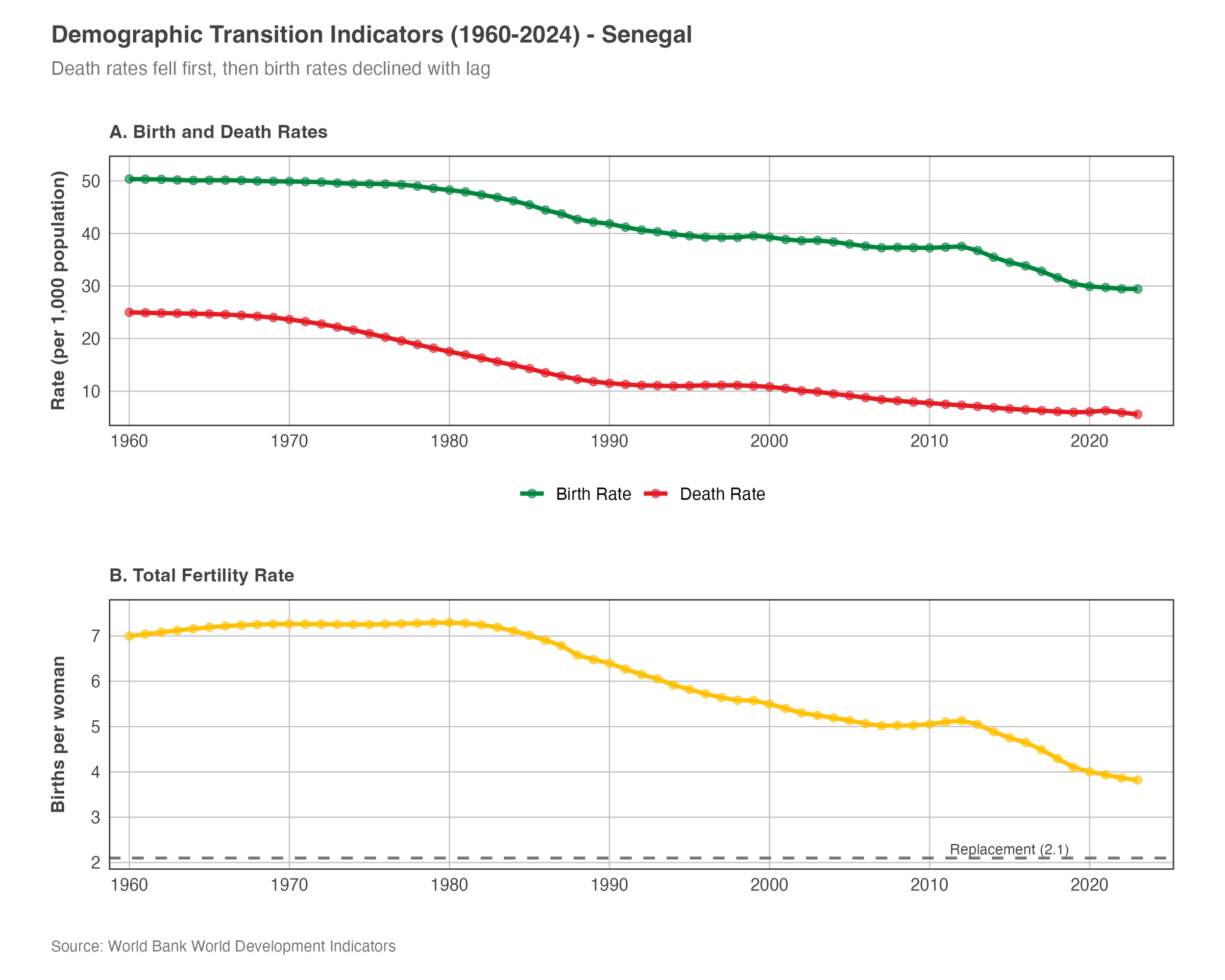 Senegal experienced a delayed and disjointed demographic transition that created a prolonged dependency burden, fundamentally constraining economic development. The standard demographic transition model suggests mortality declines should eventually trigger fertility declines, opening a “window of opportunity” when the working-age population grows faster than dependents.[4] Senegal’s transition, however, happens with a lag where death rates fell sharply from 25 per 1,000 in 1960 to approximately 6 per 1,000 by 2024, but birth rates remained stubbornly elevated above 50 per 1,000 until 1980 before gradually declining to 29 per 1,000. Similarly, total fertility remained above 7 children per woman until the 1980s and stands at approximately 4 children per woman in 2024 - still well above the replacement level of 2.1(figure 5).