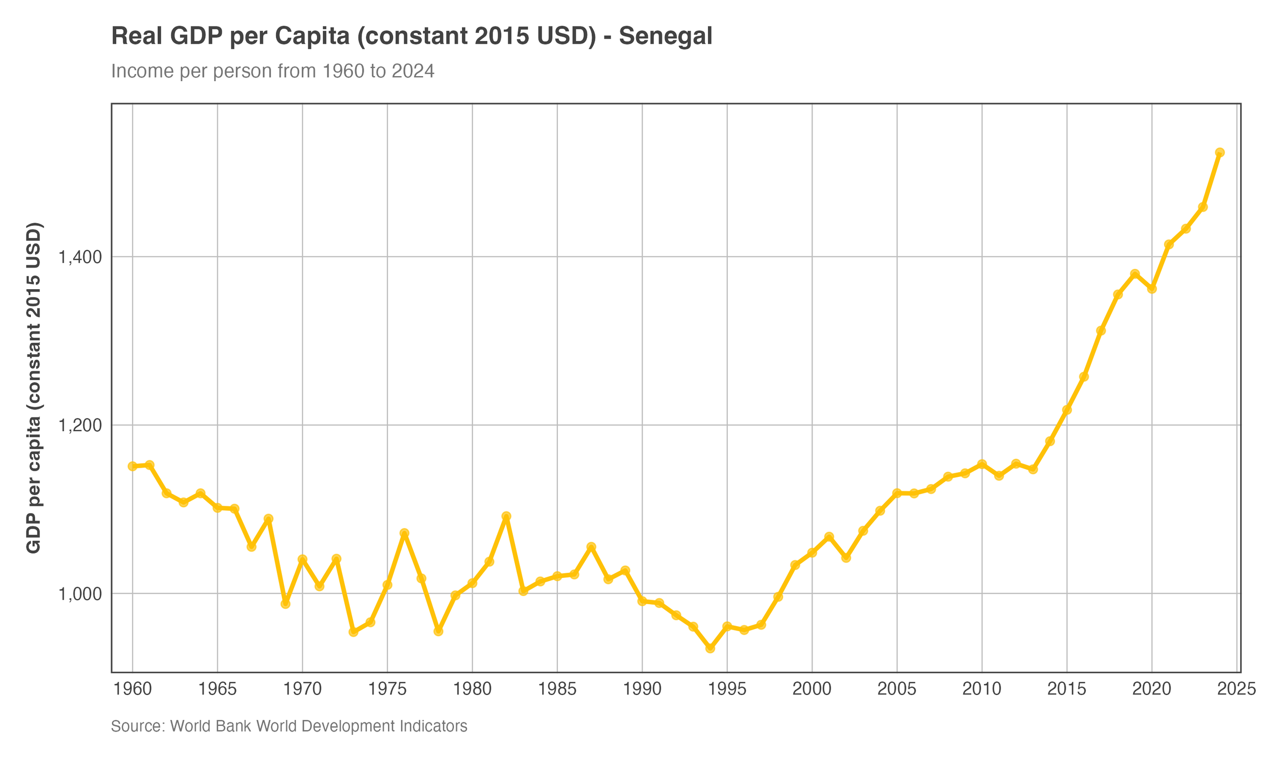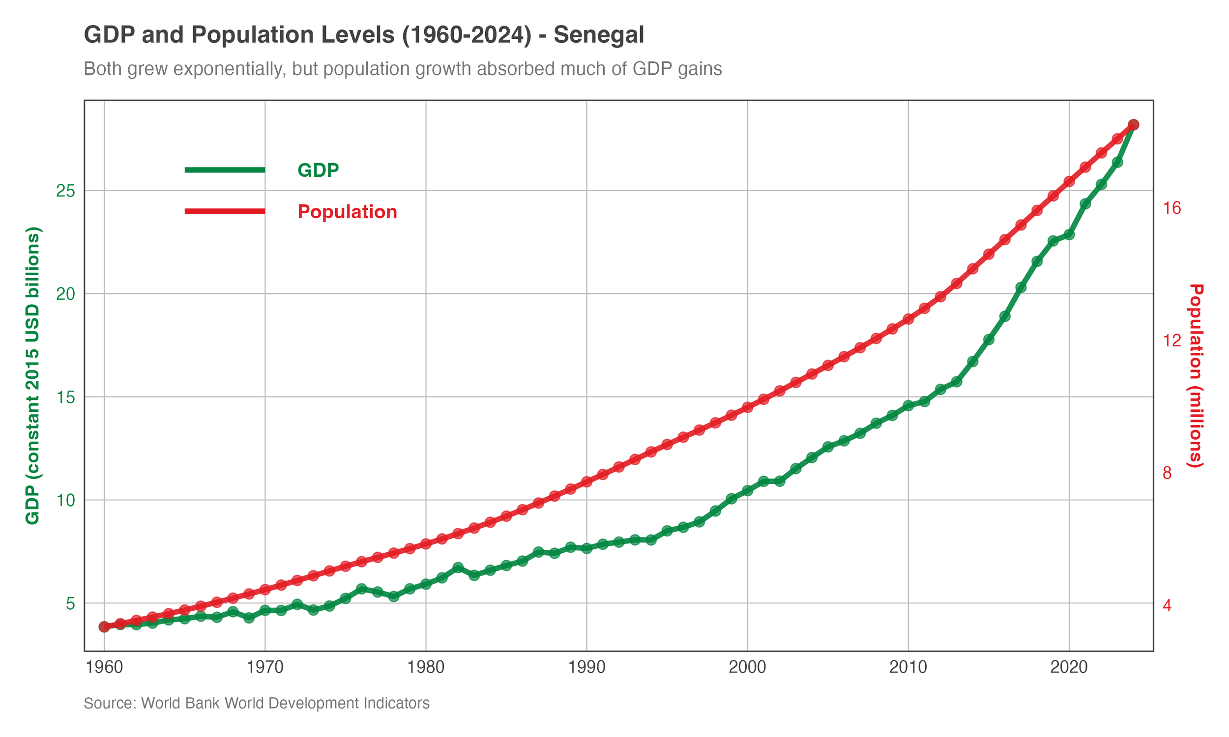 Senegal gained independence from France in 1960 and has since struggled to translate economic expansion into sustained per capita growth. Between 1960 and 2024, both GDP and population grew exponentially, with population growth systematically absorbing economic gains and suppressing per-capita income improvements for over three decades (figure 1).