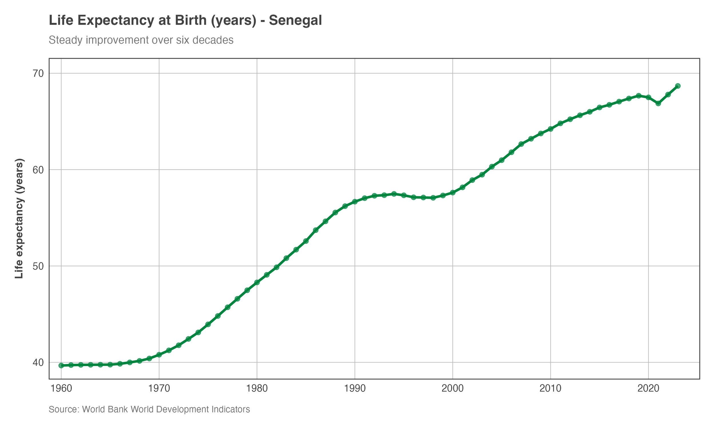 Life expectancy provides the period’s unambiguous success story, rising steadily from 40 years in 1960 to 69 years by 2024 without major disruptions (figure 4). Unlike countries devastated by conflict or HIV/AIDS epidemics, Senegal’s mortality improvements reflect consistent investments in public health infrastructure.[3] However, this demographic transition followed a problematic sequence that amplified population pressures.