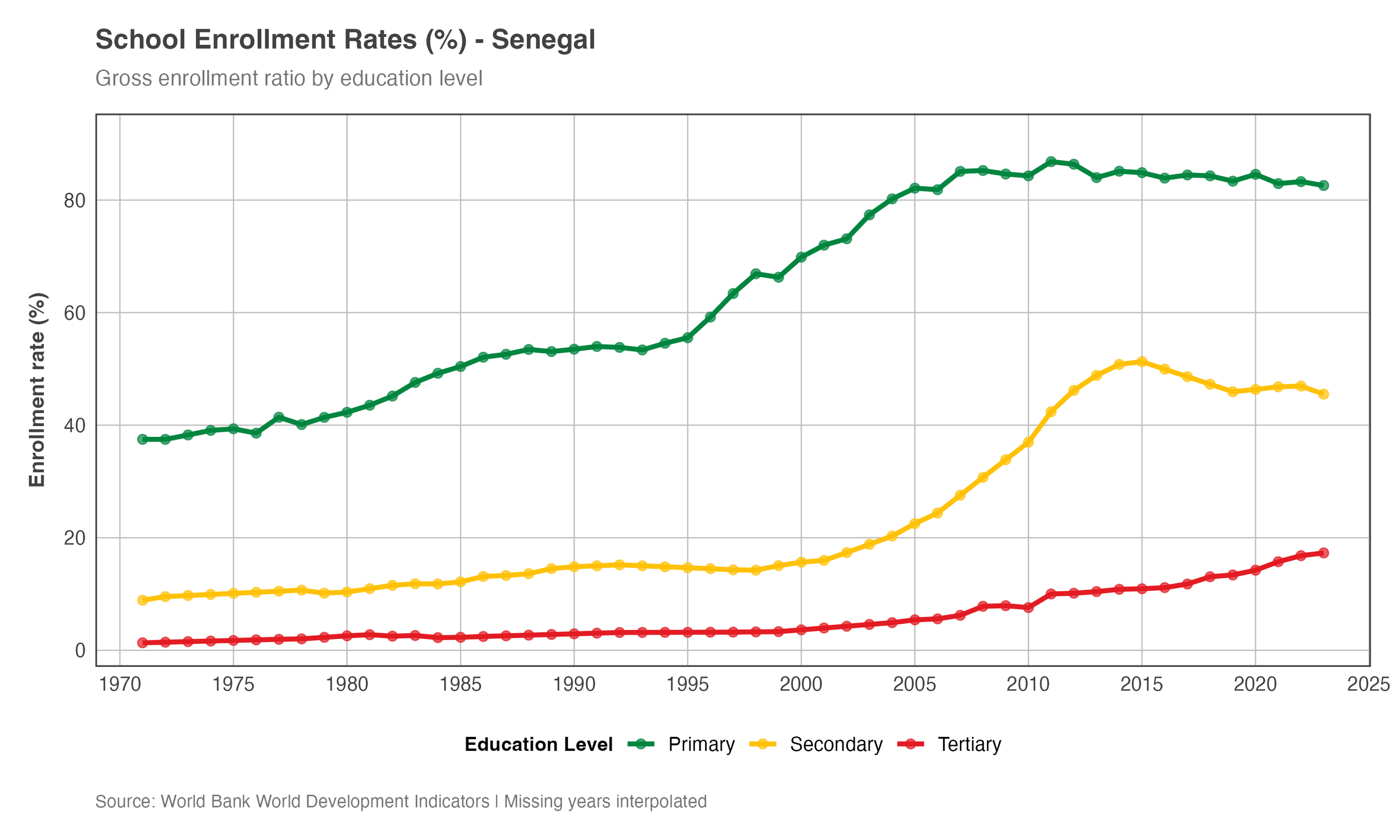 The human capital picture presents both progress and significant gaps. Primary school enrollment expanded dramatically, reaching approximately 83% by the 2010s before plateauing. Secondary enrollment accelerated after 2000, rising from 15% to 46%, though recent stagnation raises concerns about sustained momentum. Most critically, tertiary enrollment remains severely constrained at just 17% by 2024 being far below levels needed to support a knowledge economy or high-productivity service sectors (figure 7). This tertiary education gap likely constrains Senegal’s capacity to deploy its growing labor force in productive activities, limiting technological adoption and innovation, a constraint I will explore further in the next part of this series.[6]