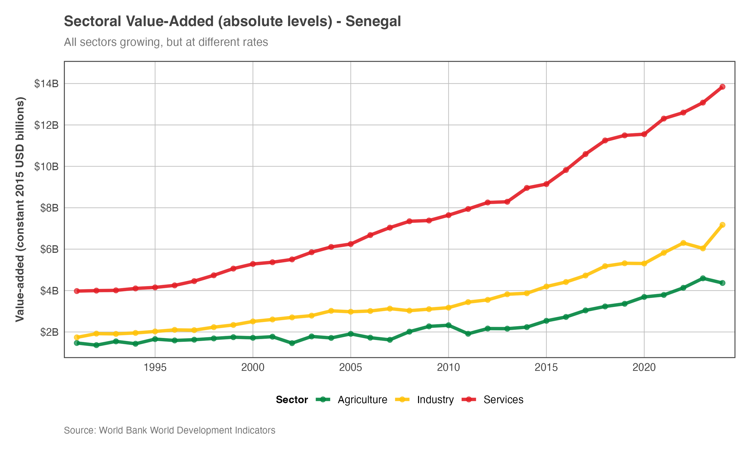 This “excess” urbanization without corresponding income gains suggests cities are not generating the agglomeration economies that typically drive urban productivity premiums.[9] Instead, Senegal’s cities appear to absorb rural-urban migrants into informal settlements and low-productivity service activities that replicate, rather than transform, rural poverty.[10]